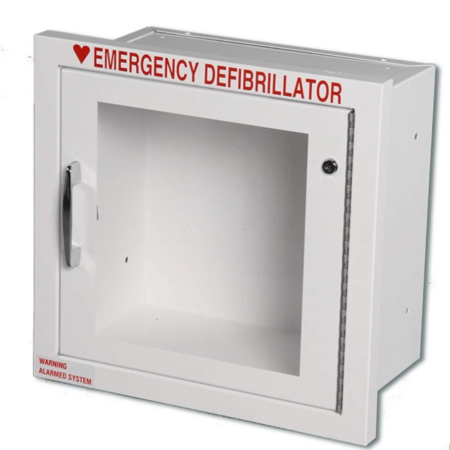 Standard Metal Wall Cabinet (9" deep) designed to hold AED Plus in a carry case with spare electrodes